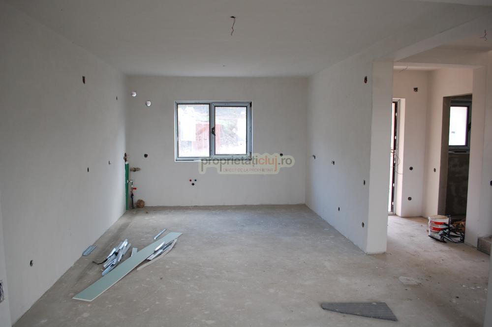 Interiourul semifinisat: peretii tencuiti, sapa turnata, tamplarie PVC termopan, toate instalatiile pe pozitii si functionale.