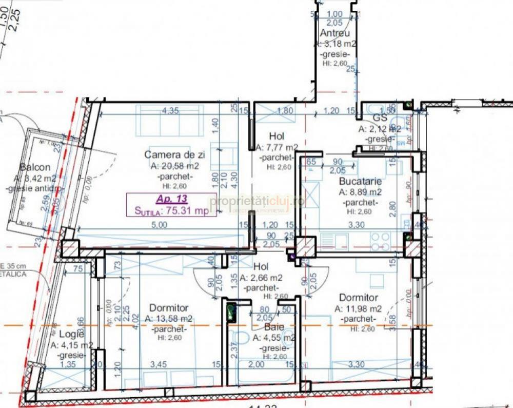 3 camere: 75.31 mp + balcon 3,42 mp + logie 4,15 mp